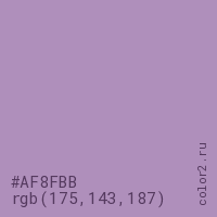 Цвет #AF8FBB в цветовой модели RGB обозначается тремя октетами (175, 143, 187) в десятичном формате и #AF8FBB в шестнадцатиричном (hex) формате, которые являются интенсивностью красного 175 (hex AF), интенсивность зелёного 143 (hex 8F) и интенсивность синего 187 (hex BB).