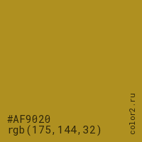 Цвет #AF9020 в цветовой модели RGB обозначается тремя октетами (175, 144, 32) в десятичном формате и #AF9020 в шестнадцатиричном (hex) формате, которые являются интенсивностью красного 175 (hex AF), интенсивность зелёного 144 (hex 90) и интенсивность синего 32 (hex 20).