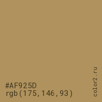 Цвет #AF925D в цветовой модели RGB обозначается тремя октетами (175, 146, 93) в десятичном формате и #AF925D в шестнадцатиричном (hex) формате, которые являются интенсивностью красного 175 (hex AF), интенсивность зелёного 146 (hex 92) и интенсивность синего 93 (hex 5D).