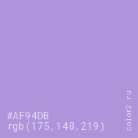 Цвет #AF94DB в цветовой модели RGB обозначается тремя октетами (175, 148, 219) в десятичном формате и #AF94DB в шестнадцатиричном (hex) формате, которые являются интенсивностью красного 175 (hex AF), интенсивность зелёного 148 (hex 94) и интенсивность синего 219 (hex DB).