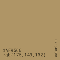 Цвет #AF9566 в цветовой модели RGB обозначается тремя октетами (175, 149, 102) в десятичном формате и #AF9566 в шестнадцатиричном (hex) формате, которые являются интенсивностью красного 175 (hex AF), интенсивность зелёного 149 (hex 95) и интенсивность синего 102 (hex 66).