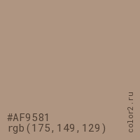 Цвет #AF9581 в цветовой модели RGB обозначается тремя октетами (175, 149, 129) в десятичном формате и #AF9581 в шестнадцатиричном (hex) формате, которые являются интенсивностью красного 175 (hex AF), интенсивность зелёного 149 (hex 95) и интенсивность синего 129 (hex 81).