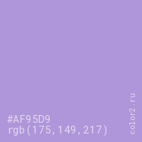 Цвет #AF95D9 в цветовой модели RGB обозначается тремя октетами (175, 149, 217) в десятичном формате и #AF95D9 в шестнадцатиричном (hex) формате, которые являются интенсивностью красного 175 (hex AF), интенсивность зелёного 149 (hex 95) и интенсивность синего 217 (hex D9).