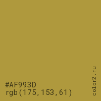 Цвет #AF993D в цветовой модели RGB обозначается тремя октетами (175, 153, 61) в десятичном формате и #AF993D в шестнадцатиричном (hex) формате, которые являются интенсивностью красного 175 (hex AF), интенсивность зелёного 153 (hex 99) и интенсивность синего 61 (hex 3D).