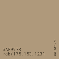 Цвет #AF997B в цветовой модели RGB обозначается тремя октетами (175, 153, 123) в десятичном формате и #AF997B в шестнадцатиричном (hex) формате, которые являются интенсивностью красного 175 (hex AF), интенсивность зелёного 153 (hex 99) и интенсивность синего 123 (hex 7B).