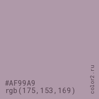 Цвет #AF99A9 в цветовой модели RGB обозначается тремя октетами (175, 153, 169) в десятичном формате и #AF99A9 в шестнадцатиричном (hex) формате, которые являются интенсивностью красного 175 (hex AF), интенсивность зелёного 153 (hex 99) и интенсивность синего 169 (hex A9).