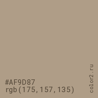 Цвет #AF9D87 в цветовой модели RGB обозначается тремя октетами (175, 157, 135) в десятичном формате и #AF9D87 в шестнадцатиричном (hex) формате, которые являются интенсивностью красного 175 (hex AF), интенсивность зелёного 157 (hex 9D) и интенсивность синего 135 (hex 87).