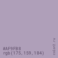 Цвет #AF9FB8 в цветовой модели RGB обозначается тремя октетами (175, 159, 184) в десятичном формате и #AF9FB8 в шестнадцатиричном (hex) формате, которые являются интенсивностью красного 175 (hex AF), интенсивность зелёного 159 (hex 9F) и интенсивность синего 184 (hex B8).