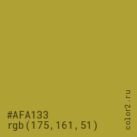 Цвет #AFA133 в цветовой модели RGB обозначается тремя октетами (175, 161, 51) в десятичном формате и #AFA133 в шестнадцатиричном (hex) формате, которые являются интенсивностью красного 175 (hex AF), интенсивность зелёного 161 (hex A1) и интенсивность синего 51 (hex 33).