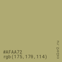 Цвет #AFAA72 в цветовой модели RGB обозначается тремя октетами (175, 170, 114) в десятичном формате и #AFAA72 в шестнадцатиричном (hex) формате, которые являются интенсивностью красного 175 (hex AF), интенсивность зелёного 170 (hex AA) и интенсивность синего 114 (hex 72).
