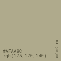 Цвет #AFAA8C в цветовой модели RGB обозначается тремя октетами (175, 170, 140) в десятичном формате и #AFAA8C в шестнадцатиричном (hex) формате, которые являются интенсивностью красного 175 (hex AF), интенсивность зелёного 170 (hex AA) и интенсивность синего 140 (hex 8C).