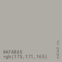 Цвет #AFABA5 в цветовой модели RGB обозначается тремя октетами (175, 171, 165) в десятичном формате и #AFABA5 в шестнадцатиричном (hex) формате, которые являются интенсивностью красного 175 (hex AF), интенсивность зелёного 171 (hex AB) и интенсивность синего 165 (hex A5).