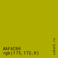Цвет #AFAC00 в цветовой модели RGB обозначается тремя октетами (175, 172, 0) в десятичном формате и #AFAC00 в шестнадцатиричном (hex) формате, которые являются интенсивностью красного 175 (hex AF), интенсивность зелёного 172 (hex AC) и интенсивность синего 0 (hex 00).