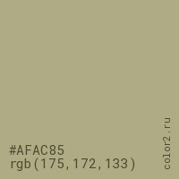 Цвет #AFAC85 в цветовой модели RGB обозначается тремя октетами (175, 172, 133) в десятичном формате и #AFAC85 в шестнадцатиричном (hex) формате, которые являются интенсивностью красного 175 (hex AF), интенсивность зелёного 172 (hex AC) и интенсивность синего 133 (hex 85).