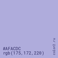Цвет #AFACDC в цветовой модели RGB обозначается тремя октетами (175, 172, 220) в десятичном формате и #AFACDC в шестнадцатиричном (hex) формате, которые являются интенсивностью красного 175 (hex AF), интенсивность зелёного 172 (hex AC) и интенсивность синего 220 (hex DC).