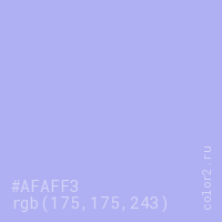 Цвет #AFAFF3 в цветовой модели RGB обозначается тремя октетами (175, 175, 243) в десятичном формате и #AFAFF3 в шестнадцатиричном (hex) формате, которые являются интенсивностью красного 175 (hex AF), интенсивность зелёного 175 (hex AF) и интенсивность синего 243 (hex F3).