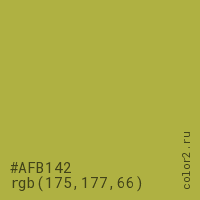 Цвет #AFB142 в цветовой модели RGB обозначается тремя октетами (175, 177, 66) в десятичном формате и #AFB142 в шестнадцатиричном (hex) формате, которые являются интенсивностью красного 175 (hex AF), интенсивность зелёного 177 (hex B1) и интенсивность синего 66 (hex 42).