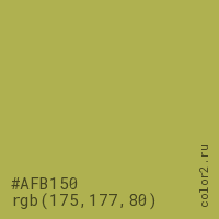 Цвет #AFB150 в цветовой модели RGB обозначается тремя октетами (175, 177, 80) в десятичном формате и #AFB150 в шестнадцатиричном (hex) формате, которые являются интенсивностью красного 175 (hex AF), интенсивность зелёного 177 (hex B1) и интенсивность синего 80 (hex 50).