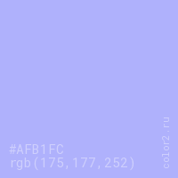 Цвет #AFB1FC в цветовой модели RGB обозначается тремя октетами (175, 177, 252) в десятичном формате и #AFB1FC в шестнадцатиричном (hex) формате, которые являются интенсивностью красного 175 (hex AF), интенсивность зелёного 177 (hex B1) и интенсивность синего 252 (hex FC).