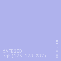 Цвет #AFB2ED в цветовой модели RGB обозначается тремя октетами (175, 178, 237) в десятичном формате и #AFB2ED в шестнадцатиричном (hex) формате, которые являются интенсивностью красного 175 (hex AF), интенсивность зелёного 178 (hex B2) и интенсивность синего 237 (hex ED).