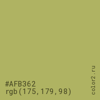 Цвет #AFB362 в цветовой модели RGB обозначается тремя октетами (175, 179, 98) в десятичном формате и #AFB362 в шестнадцатиричном (hex) формате, которые являются интенсивностью красного 175 (hex AF), интенсивность зелёного 179 (hex B3) и интенсивность синего 98 (hex 62).