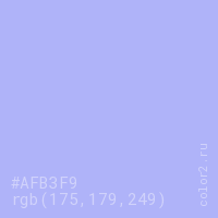 Цвет #AFB3F9 в цветовой модели RGB обозначается тремя октетами (175, 179, 249) в десятичном формате и #AFB3F9 в шестнадцатиричном (hex) формате, которые являются интенсивностью красного 175 (hex AF), интенсивность зелёного 179 (hex B3) и интенсивность синего 249 (hex F9).