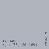 Цвет #AFB4BD в цветовой модели RGB обозначается тремя октетами (175, 180, 189) в десятичном формате и #AFB4BD в шестнадцатиричном (hex) формате, которые являются интенсивностью красного 175 (hex AF), интенсивность зелёного 180 (hex B4) и интенсивность синего 189 (hex BD).