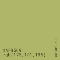 Цвет #AFB569 в цветовой модели RGB обозначается тремя октетами (175, 181, 105) в десятичном формате и #AFB569 в шестнадцатиричном (hex) формате, которые являются интенсивностью красного 175 (hex AF), интенсивность зелёного 181 (hex B5) и интенсивность синего 105 (hex 69).