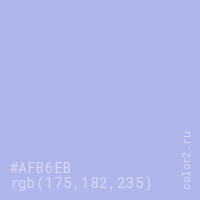 Цвет #AFB6EB в цветовой модели RGB обозначается тремя октетами (175, 182, 235) в десятичном формате и #AFB6EB в шестнадцатиричном (hex) формате, которые являются интенсивностью красного 175 (hex AF), интенсивность зелёного 182 (hex B6) и интенсивность синего 235 (hex EB).