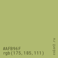 Цвет #AFB96F в цветовой модели RGB обозначается тремя октетами (175, 185, 111) в десятичном формате и #AFB96F в шестнадцатиричном (hex) формате, которые являются интенсивностью красного 175 (hex AF), интенсивность зелёного 185 (hex B9) и интенсивность синего 111 (hex 6F).