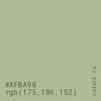 Цвет #AFBA98 в цветовой модели RGB обозначается тремя октетами (175, 186, 152) в десятичном формате и #AFBA98 в шестнадцатиричном (hex) формате, которые являются интенсивностью красного 175 (hex AF), интенсивность зелёного 186 (hex BA) и интенсивность синего 152 (hex 98).