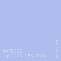 Цвет #AFBCEE в цветовой модели RGB обозначается тремя октетами (175, 188, 238) в десятичном формате и #AFBCEE в шестнадцатиричном (hex) формате, которые являются интенсивностью красного 175 (hex AF), интенсивность зелёного 188 (hex BC) и интенсивность синего 238 (hex EE).