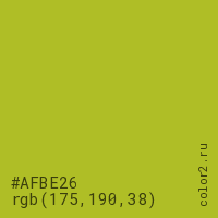 Цвет #AFBE26 в цветовой модели RGB обозначается тремя октетами (175, 190, 38) в десятичном формате и #AFBE26 в шестнадцатиричном (hex) формате, которые являются интенсивностью красного 175 (hex AF), интенсивность зелёного 190 (hex BE) и интенсивность синего 38 (hex 26).