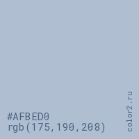 Цвет #AFBED0 в цветовой модели RGB обозначается тремя октетами (175, 190, 208) в десятичном формате и #AFBED0 в шестнадцатиричном (hex) формате, которые являются интенсивностью красного 175 (hex AF), интенсивность зелёного 190 (hex BE) и интенсивность синего 208 (hex D0).