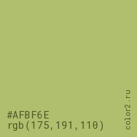 Цвет #AFBF6E в цветовой модели RGB обозначается тремя октетами (175, 191, 110) в десятичном формате и #AFBF6E в шестнадцатиричном (hex) формате, которые являются интенсивностью красного 175 (hex AF), интенсивность зелёного 191 (hex BF) и интенсивность синего 110 (hex 6E).