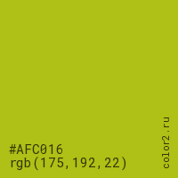 Цвет #AFC016 в цветовой модели RGB обозначается тремя октетами (175, 192, 22) в десятичном формате и #AFC016 в шестнадцатиричном (hex) формате, которые являются интенсивностью красного 175 (hex AF), интенсивность зелёного 192 (hex C0) и интенсивность синего 22 (hex 16).