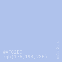 Цвет #AFC2EC в цветовой модели RGB обозначается тремя октетами (175, 194, 236) в десятичном формате и #AFC2EC в шестнадцатиричном (hex) формате, которые являются интенсивностью красного 175 (hex AF), интенсивность зелёного 194 (hex C2) и интенсивность синего 236 (hex EC).