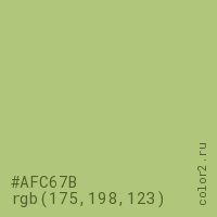 Цвет #AFC67B в цветовой модели RGB обозначается тремя октетами (175, 198, 123) в десятичном формате и #AFC67B в шестнадцатиричном (hex) формате, которые являются интенсивностью красного 175 (hex AF), интенсивность зелёного 198 (hex C6) и интенсивность синего 123 (hex 7B).