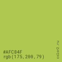 Цвет #AFC84F в цветовой модели RGB обозначается тремя октетами (175, 200, 79) в десятичном формате и #AFC84F в шестнадцатиричном (hex) формате, которые являются интенсивностью красного 175 (hex AF), интенсивность зелёного 200 (hex C8) и интенсивность синего 79 (hex 4F).
