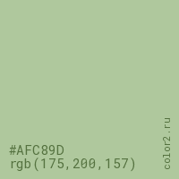 Цвет #AFC89D в цветовой модели RGB обозначается тремя октетами (175, 200, 157) в десятичном формате и #AFC89D в шестнадцатиричном (hex) формате, которые являются интенсивностью красного 175 (hex AF), интенсивность зелёного 200 (hex C8) и интенсивность синего 157 (hex 9D).
