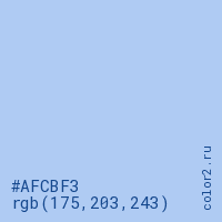 Цвет #AFCBF3 в цветовой модели RGB обозначается тремя октетами (175, 203, 243) в десятичном формате и #AFCBF3 в шестнадцатиричном (hex) формате, которые являются интенсивностью красного 175 (hex AF), интенсивность зелёного 203 (hex CB) и интенсивность синего 243 (hex F3).