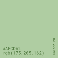 Цвет #AFCDA2 в цветовой модели RGB обозначается тремя октетами (175, 205, 162) в десятичном формате и #AFCDA2 в шестнадцатиричном (hex) формате, которые являются интенсивностью красного 175 (hex AF), интенсивность зелёного 205 (hex CD) и интенсивность синего 162 (hex A2).