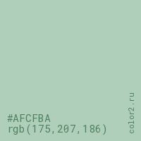 Цвет #AFCFBA в цветовой модели RGB обозначается тремя октетами (175, 207, 186) в десятичном формате и #AFCFBA в шестнадцатиричном (hex) формате, которые являются интенсивностью красного 175 (hex AF), интенсивность зелёного 207 (hex CF) и интенсивность синего 186 (hex BA).