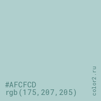 Цвет #AFCFCD в цветовой модели RGB обозначается тремя октетами (175, 207, 205) в десятичном формате и #AFCFCD в шестнадцатиричном (hex) формате, которые являются интенсивностью красного 175 (hex AF), интенсивность зелёного 207 (hex CF) и интенсивность синего 205 (hex CD).