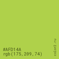 Цвет #AFD14A в цветовой модели RGB обозначается тремя октетами (175, 209, 74) в десятичном формате и #AFD14A в шестнадцатиричном (hex) формате, которые являются интенсивностью красного 175 (hex AF), интенсивность зелёного 209 (hex D1) и интенсивность синего 74 (hex 4A).