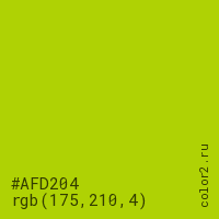 Цвет #AFD204 в цветовой модели RGB обозначается тремя октетами (175, 210, 4) в десятичном формате и #AFD204 в шестнадцатиричном (hex) формате, которые являются интенсивностью красного 175 (hex AF), интенсивность зелёного 210 (hex D2) и интенсивность синего 4 (hex 04).