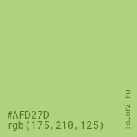 Цвет #AFD27D в цветовой модели RGB обозначается тремя октетами (175, 210, 125) в десятичном формате и #AFD27D в шестнадцатиричном (hex) формате, которые являются интенсивностью красного 175 (hex AF), интенсивность зелёного 210 (hex D2) и интенсивность синего 125 (hex 7D).