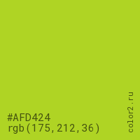 Цвет #AFD424 в цветовой модели RGB обозначается тремя октетами (175, 212, 36) в десятичном формате и #AFD424 в шестнадцатиричном (hex) формате, которые являются интенсивностью красного 175 (hex AF), интенсивность зелёного 212 (hex D4) и интенсивность синего 36 (hex 24).