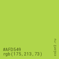 Цвет #AFD549 в цветовой модели RGB обозначается тремя октетами (175, 213, 73) в десятичном формате и #AFD549 в шестнадцатиричном (hex) формате, которые являются интенсивностью красного 175 (hex AF), интенсивность зелёного 213 (hex D5) и интенсивность синего 73 (hex 49).
