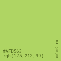 Цвет #AFD563 в цветовой модели RGB обозначается тремя октетами (175, 213, 99) в десятичном формате и #AFD563 в шестнадцатиричном (hex) формате, которые являются интенсивностью красного 175 (hex AF), интенсивность зелёного 213 (hex D5) и интенсивность синего 99 (hex 63).